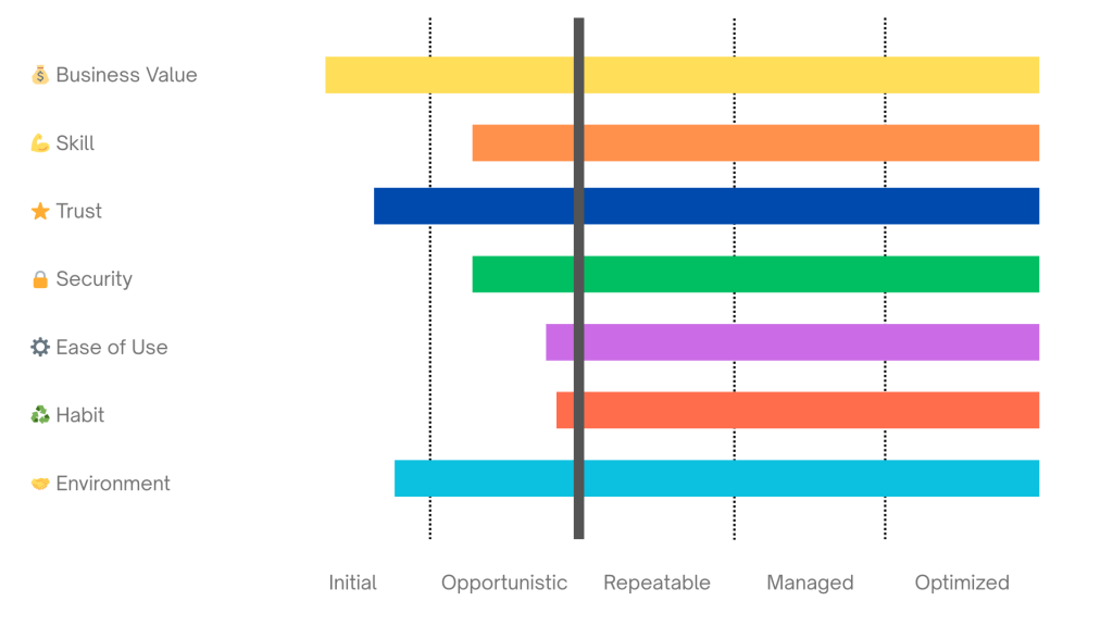 A Gartner technológiai érettségi modellje szerint a fenntartható, ismételhető AI-használat a Repeatable szinttől indul, és a legnagyobb előrelépés az Opportunistic → Repeatable átmenetnél történik.